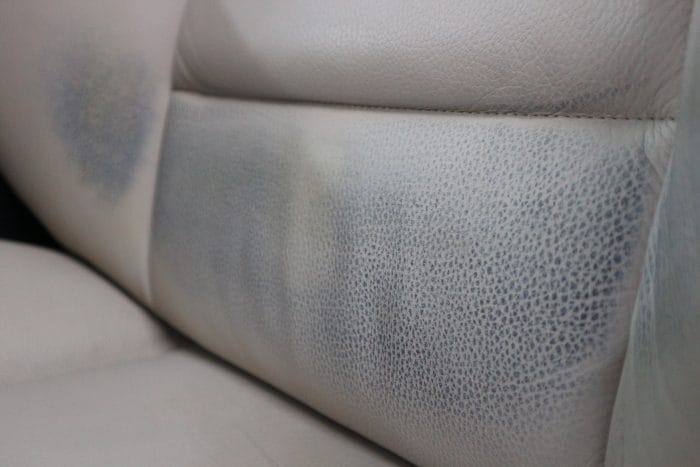 Prima operatiune efectuata efectiv pe piele a fost aceea de curatare temeinica, pentru a inlatura mizeria si pentru a fi siguri ca se potriveste culoarea anterior preparata. Dupa procesul de curatare a urmat inlaturarea petelor albastre cu o solutie speciala, care este extrem de eficienta. Acest transfer de culoare trebuie eliminat complet pentru ca, in timp, el se va ridica la suprafata vopselei aplicate daca nu este corect inlaturat. A urmat apoi pregatirea clasica pentru revopsire – smirgheluire, degresare si primer special.